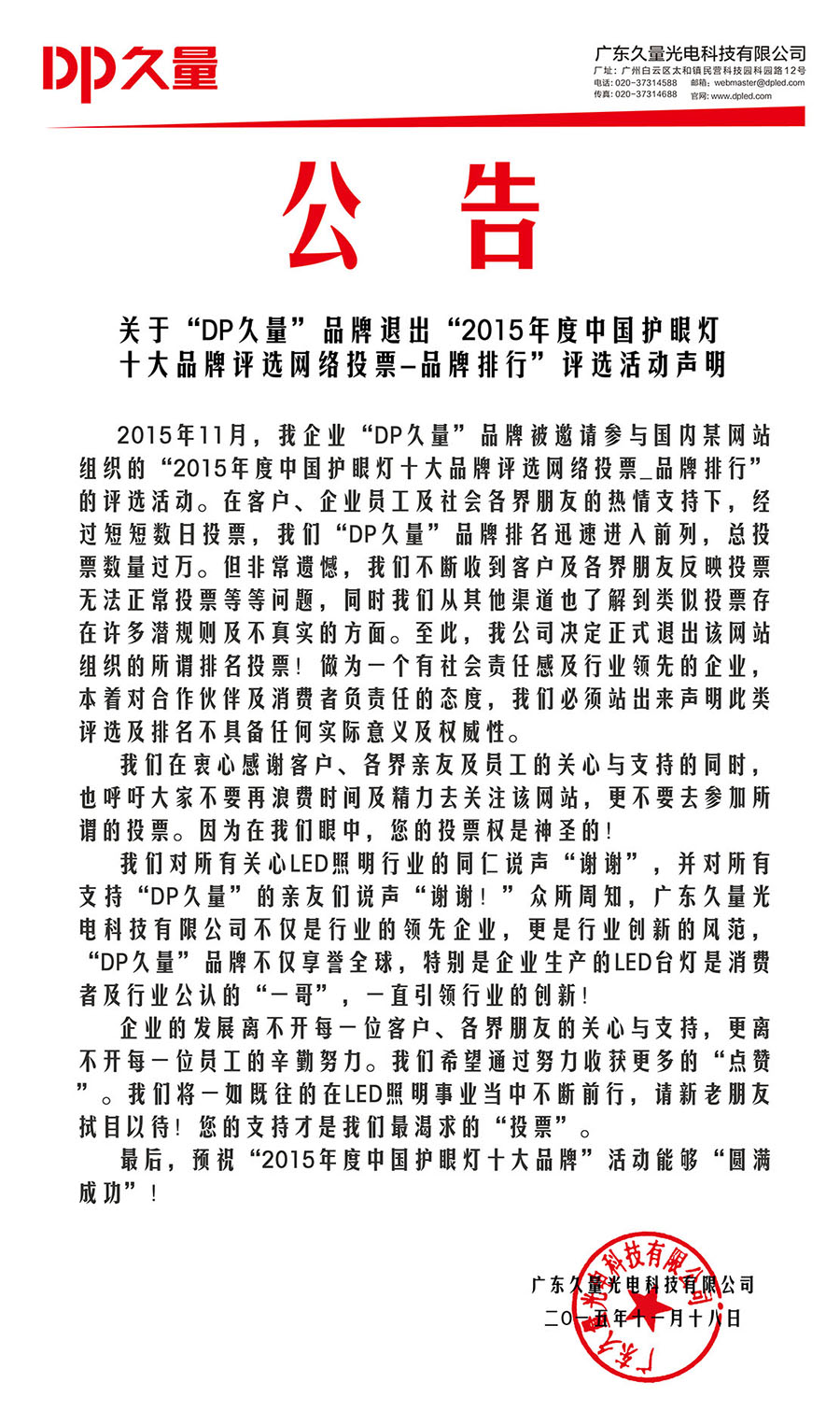 “DP久量”退出品牌排行評(píng)選活動(dòng)聲明