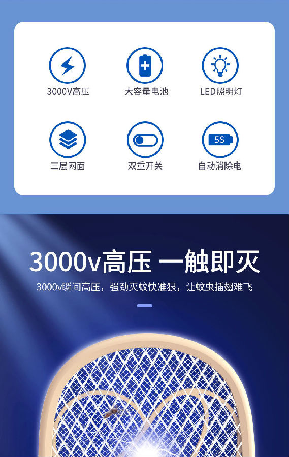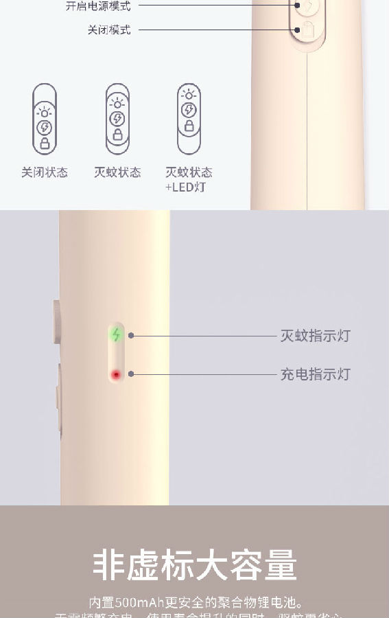 照明采用兩顆LED燈,既能獨立照明,也能為夜間辨別蚊子方位提供輔助照明。
